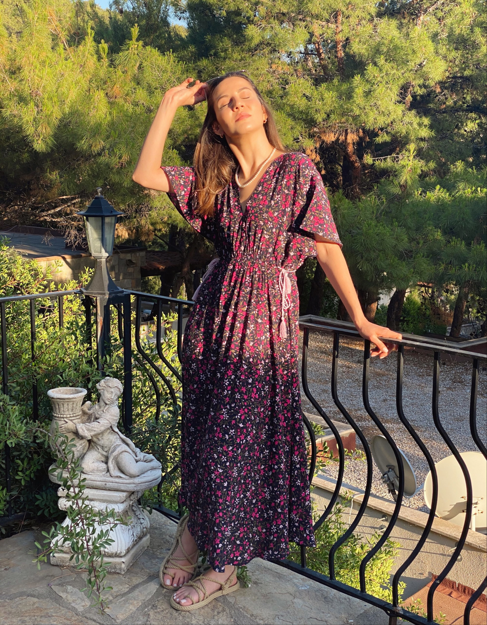This beautifully made V-neck dress is perfectly draped for a playful look. By fluttering short sleeves and secured with adjustable waist ties for a perfect fit.