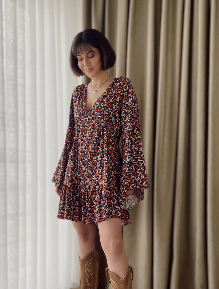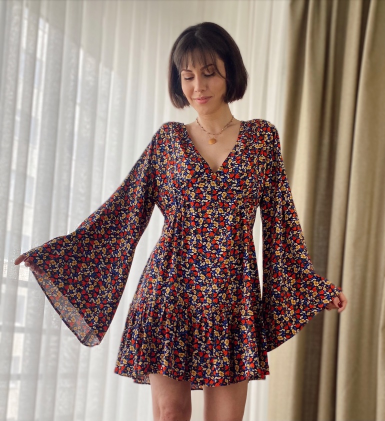 Vintage boho chic style dress with delicate flowers. Cheery dress takes you to the free days of the 70s with its bold and joy stance. This timeless dress, which you can easily combine according to all seasons, is ready to add joy to your soul.Wear yours with sandals during the day or heels come evening. We love it with boots for that extra boho look.